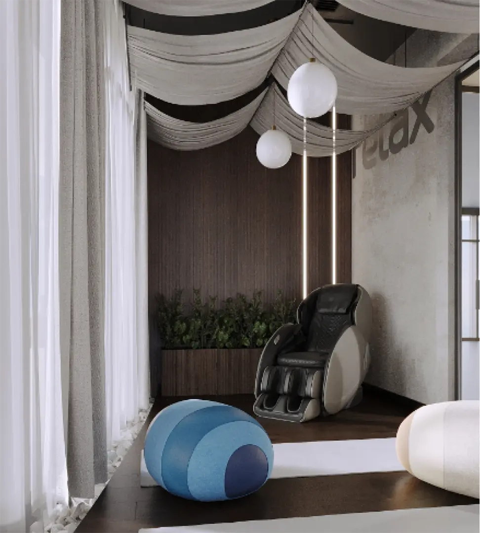 The relaxation area with massage chairs and meditation accessories provides a secluded space for relaxation and rejuvenation, contributing to rest and inspiration. These places are ideal for short breaks, allowing employees to recharge during the day.