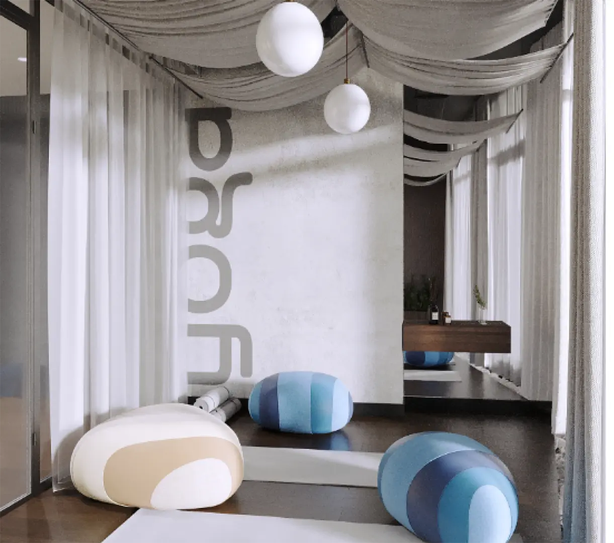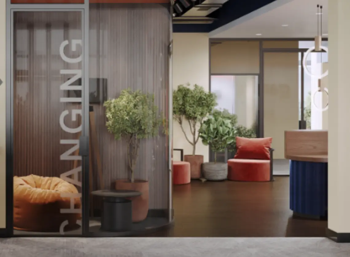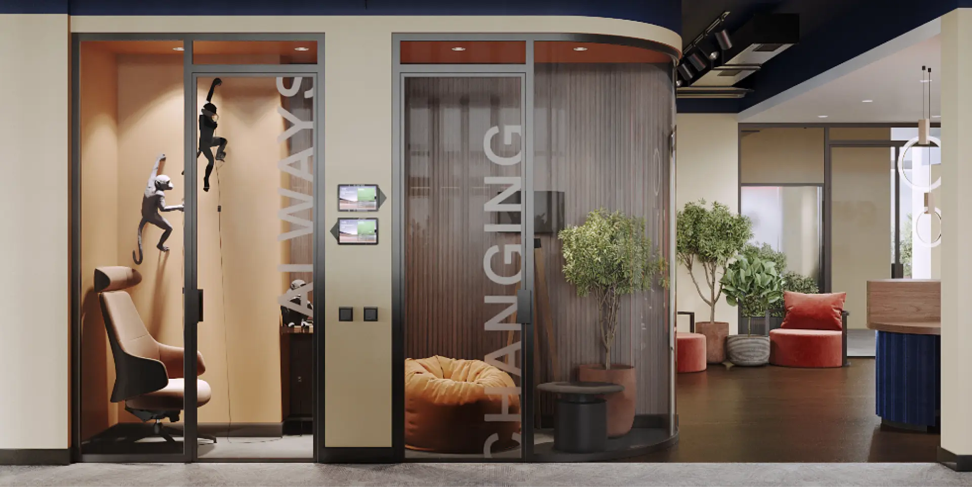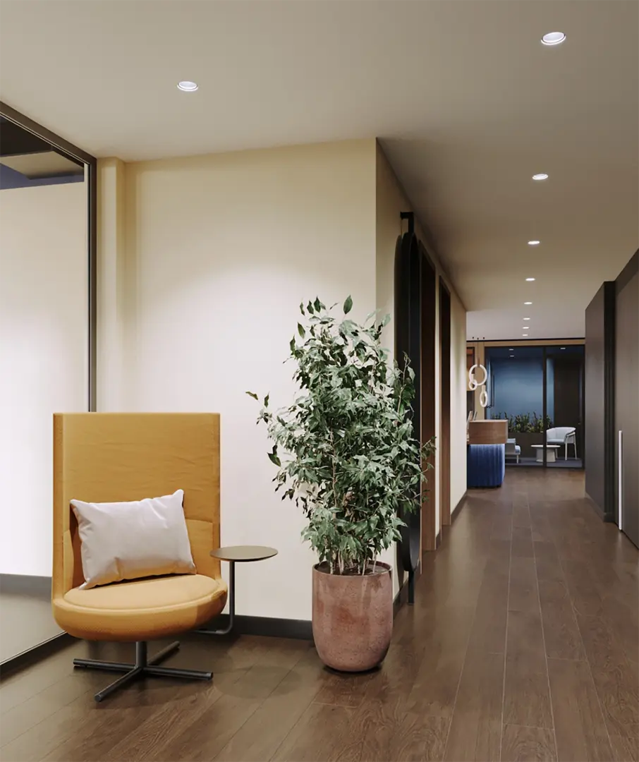 It becomes the central point of visual zoning of the space and sets the tone for the entire interior. The reception area transitions into a zone with soft armchairs and sofas, inviting relaxation and informal meetings.
