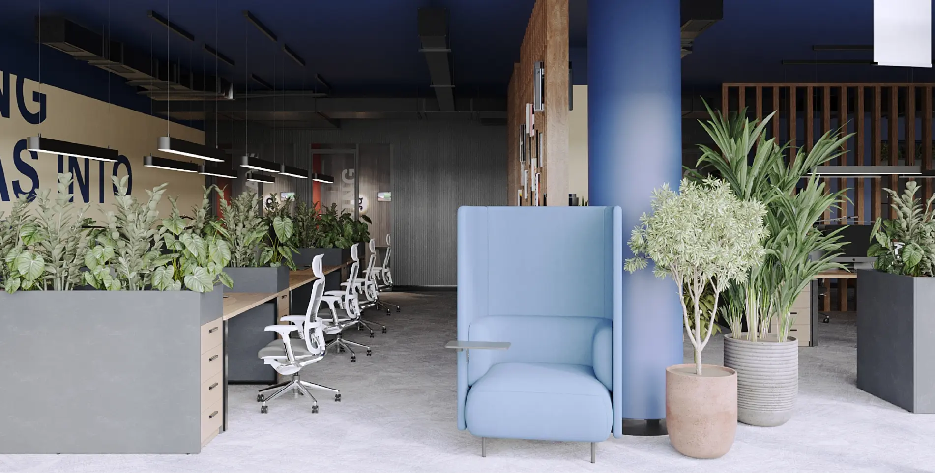 This spacious and bright office is designed with the latest trends in design in mind, ensuring convenience, stimulating creativity, and boosting employee productivity. It’s based on a combination of modern design and comfort with maximum functionality and aesthetics. The company’s specifics and previous experience have formed the need for many individual booths and meeting rooms, so we planned many isolated booths for one-on-one communication.