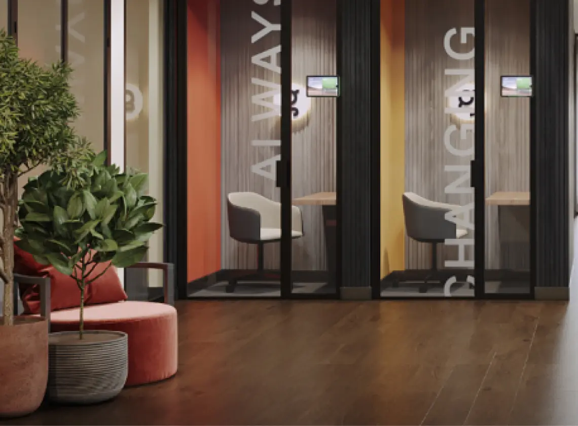 All meeting spaces are created based on a reinforced double glass structure with ventilation, air conditioning, and additional sound-absorbing panels. The sound is distributed evenly and does not pass from one meeting room to another.