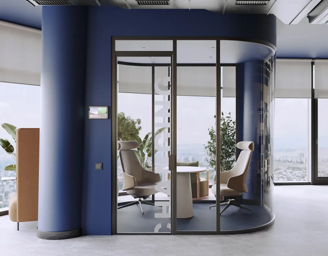 Here’s the thing: first, glass actively resonates, and in a meeting room with a TV, there can be an echo. Second, the glass structure is not monolithic, which allows sound to spread, and the characteristics of an open space require enhanced sound insulation.