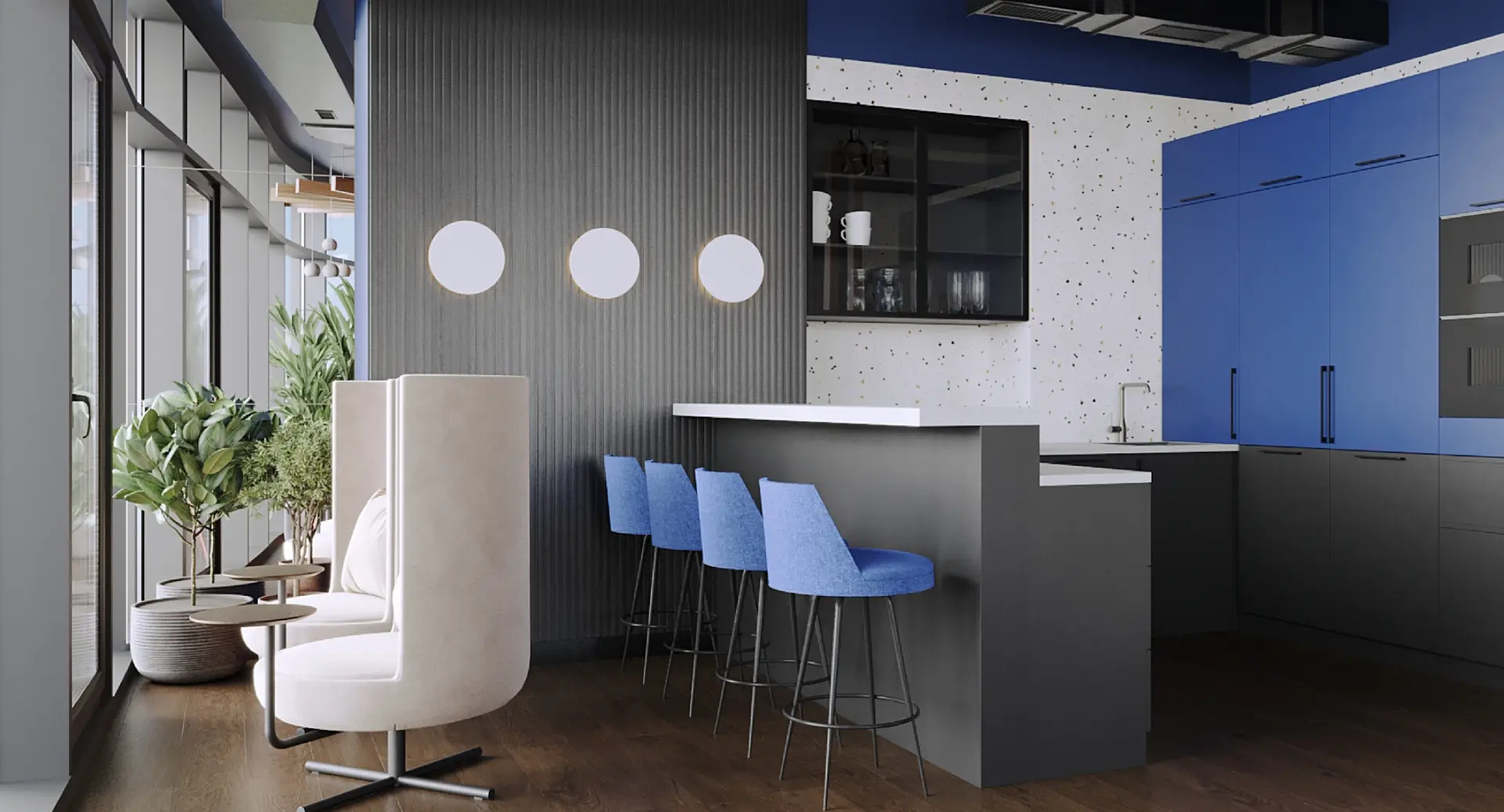 Given the small size of the dining area, we needed creative ideas for its implementation. Simply placing tables would have been boring, so we came up with the idea of an atrium podium with cushions and a central composition featuring a tree. The kitchen and dining area are equipped with modern appliances and offer a convenient place for socializing, snacking, and working.